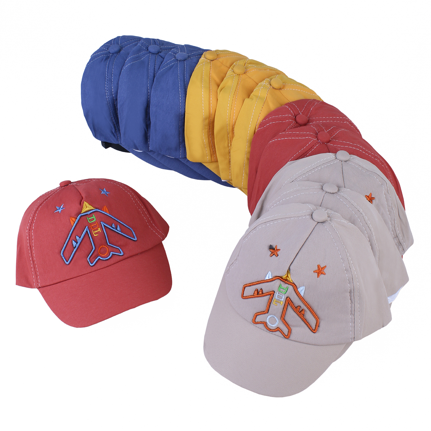خصوصیت ظاهری :دارای بند چسبی قابل تنظیم , دارای رنگبندی , طرح هواپیما بالای کلاه , طرح گلدوزی بالای کلاه