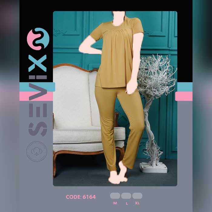 این ست شامل یک تی شرت آستین کوتاه با یقه گرد و یک شلوار ساده راسته است. ست بلوز و شلوار سویکس به رنگ خردلی برای پوشیدن در خانه و روزمره عالی است. این ست در رنگ های مختلف موجود است.