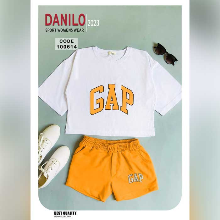کراپ شورتک دانیلو Danilo طرح GAP یک انتخاب عالی برای بانوان ورزشکار و خوش سلیقه ای است که به دنبال یک ست ورزشی جذاب و راحت هستند. این ست شامل یک کراپ، یک شورتک است که از جنس پنبه درجه یک باکیفیت تهیه شده. کمر هفتی و بند تزئینی آن ظاهر جذابی به این ست داده است.