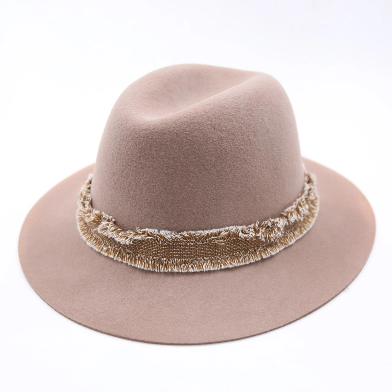 خصوصیت ظاهری :تهیه شده از نمد 100 درصد طبیعی پشمی متراکم و بسیار مرغوب , دور لبه کوتاه (7 سانتی متری) , در طراحی این کلاه از باند جین ریش ریش استفاده شده است , دارای باند عرق گیر داخلی با قابلیت تنظیم سایز تا 3 شماره