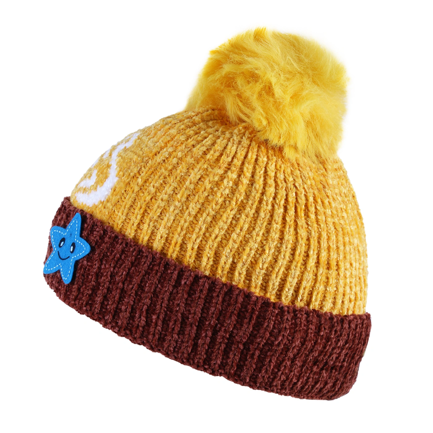 خصوصیت ظاهری :پوم دار , دارای تکه دوزی برجسته در قسمت کناری کلاه , دارای بافت عروسکی جلوی کلاه