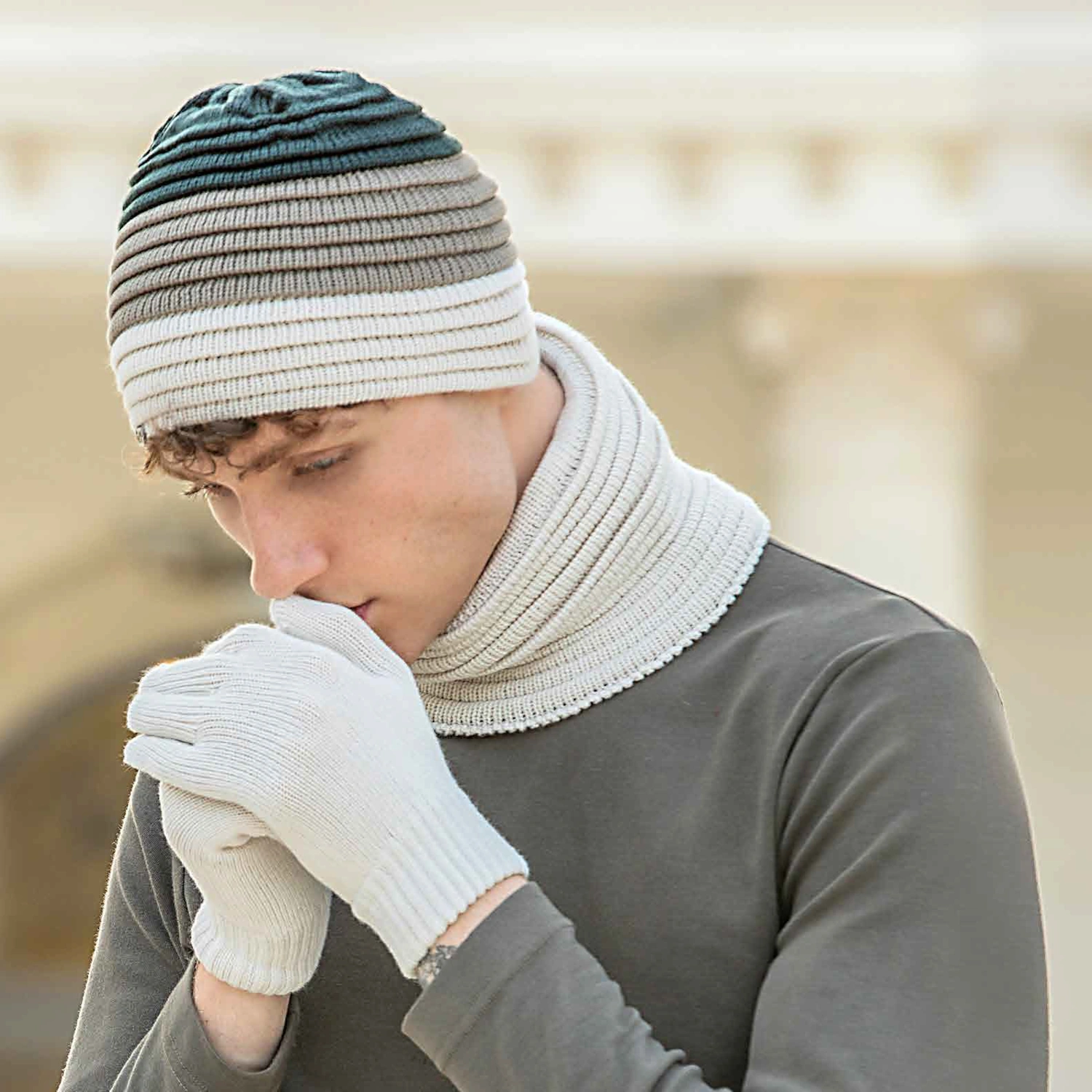 خصوصیت ظاهری :مدل بافت کلاه و شال برجسته است , کلاه دارای سه رنگ بافت متفاوت است , شال رینگی